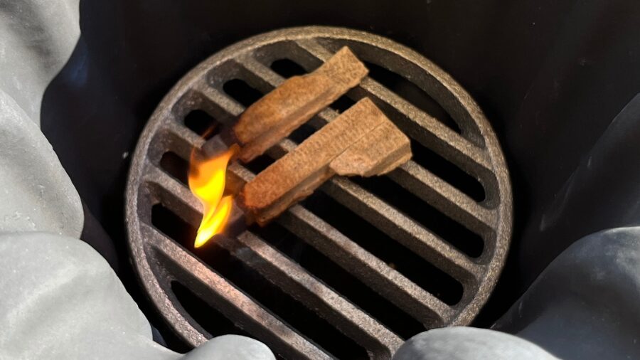 まず、中央部に空間をあけて岩手切炭を積み上げて、中に火を付けた着火剤2本を放り込みます。