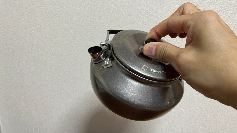 フタは結構しっかり目にハマります。写真のように、フタのツマミだけをつまんでケトルを持ち上げて、振っても外れません。